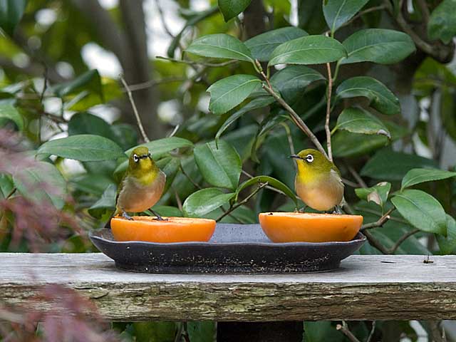毎日数回水浴にやってくるメジロですが、ご好意で分けていただいた柿が沢山手に入りましたので昨日からサービスするとすぐにペアでやって来ました。