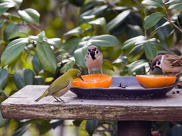 バードバスと同じように、気丈にも、スズメの中に割り込んで行きます。