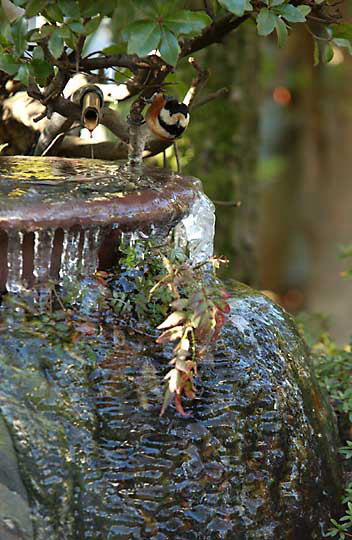 水道水はバードバスからあふれて下の石の表面を伝わって池に落ちるようになっていますが、途中で凍りついています。