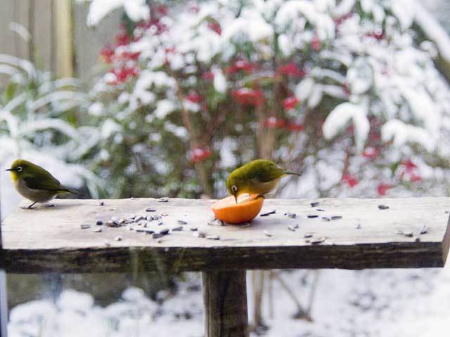 メジロもやって来たのでとりあえず、ミカンを出してやりました。