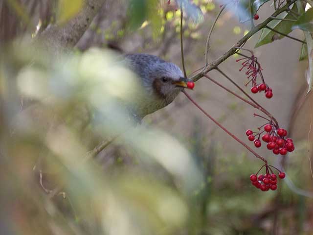 今まで手つかずだったマンリョウの実をヒヨドリが食べ始めました。