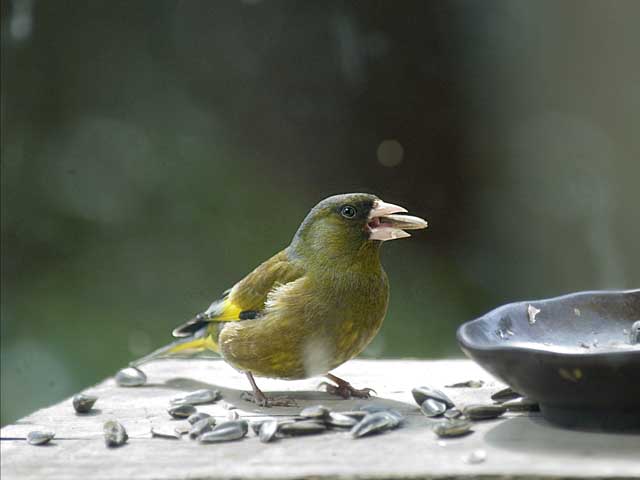カワラヒワも最近は窓のすぐ外の餌台に来るようになってきました。