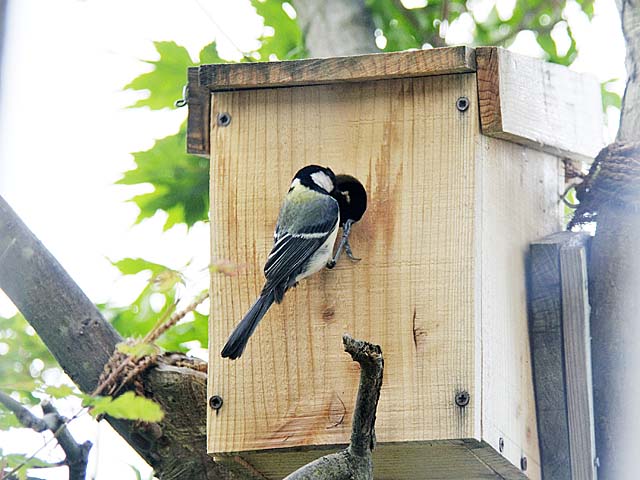 今年は裏庭の巣箱の入口の径を今までよりも2mmほど縮めて26mmで制作した効果もあってか、幸いにしてスズメも寄りつかなくなり5月も中旬になってやっとシジュウカラが営巣を初めました。