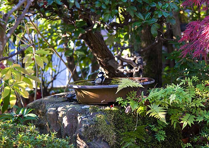 桜紅葉の浮いたお風呂ではシジュウカラが水浴中です。