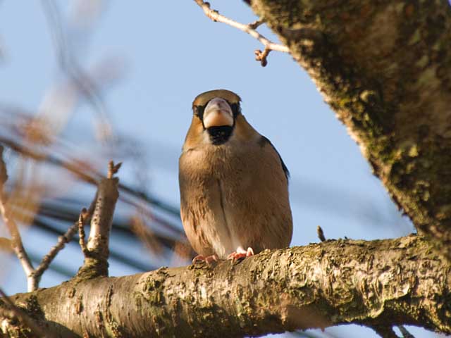正面下から見上げると太い嘴がおもしろい顔に見えます。