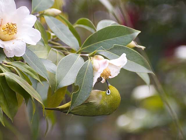 庭のツバキの花に来たメジロです。