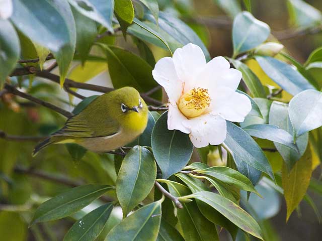 今はツバキやサザンカの花盛りなのでメジロやヒヨドリがよくやって来ます。