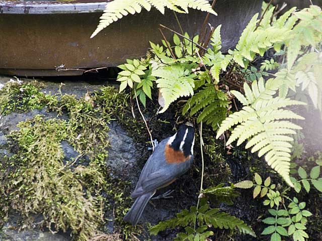 この写真はヒマワリの種をバードバスの台になっている石に生えた苔のなかに隠しているところです。