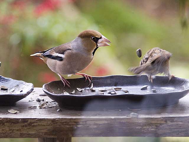 スズメはなんとかシメのスキを伺ってヒマワリの種を食べようとするのですが結局すぐにシメのひと睨みで餌を放りだして逃げてゆきます。
