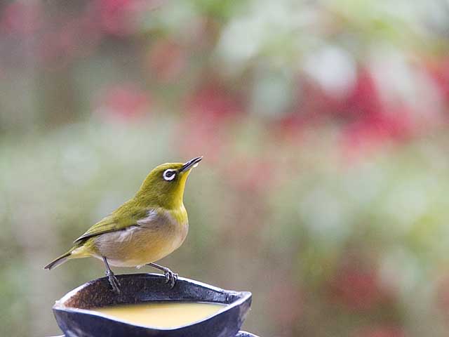 嘴をジュースに入れてから上を向いてジュースを流し込むように飲んでいます。