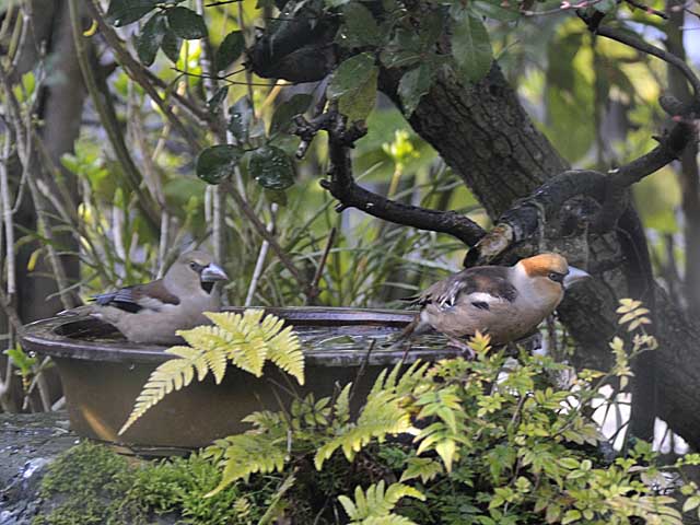 雄が水浴びを終わって出ようとしていて、雌の方がこれから水浴を始めるところです。