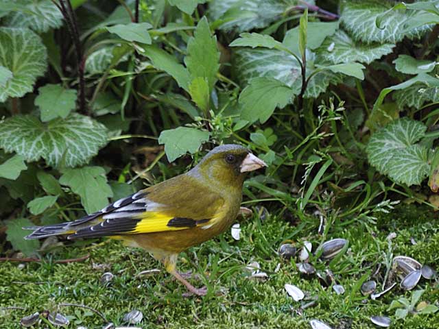 今年はどうしたことか、カワラヒワは餌台に乗らずにもっぱら下に落ちたひまわりを食べています。