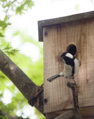 庭の巣箱のシジュウカラ