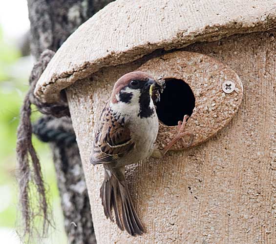 こちらは桜の木にかけた信楽焼の巣箱に入った雀です。