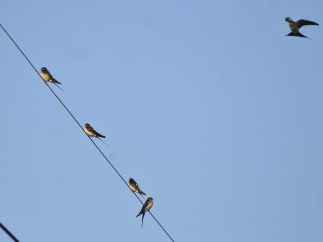 二階の窓から外を見ていると庭のすぐ外の電線にツバメの群が下りてきました。