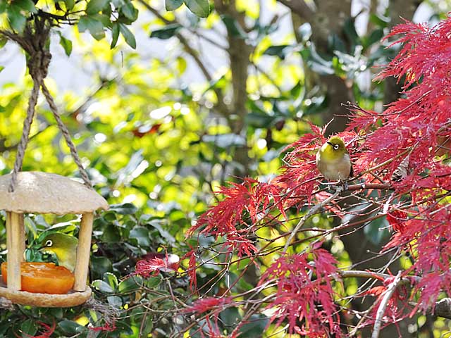 ちょっと絵が小さいですが一羽がたべているときにはやはりもう一羽は紅葉の枝でおとなしく待っています。