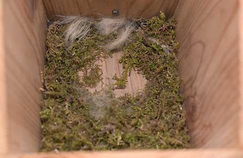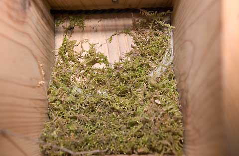 2004.03.27 初日夕刻の巣箱 巣箱は入り口が少し下向きになるように傾けています。 苔は床が水平になるようにおいてゆきますので、まだ、巣箱の奥の方の1/3程度が見えています。 |