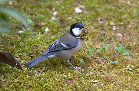 2004.03.30 シジュウカラの苔集め 巣箱に敷く苔は南側の庭から集めています。 梅の木の下の苔をむしってせっせとくわえてゆきます。 犬の毛は向こう三軒両隣のほとんどの家に犬がいますので、これも手近なところから持ってきているのでしょう。 |