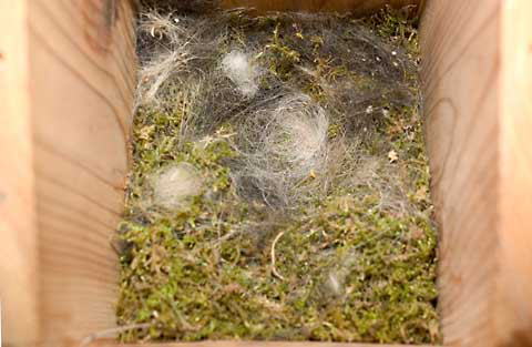 2004.03.31 巣箱内部 夕刻の撮影です。 今日はせっせと仕事をしていましたので、苔が十分に敷き詰められていて犬の毛もかなり入っています。 ご近所に黒毛の犬もいるようです。 明日の朝には第一卵の産卵と予測していますが果たして? |