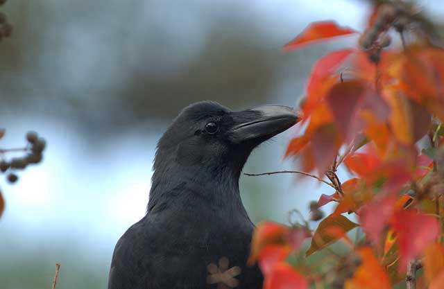 黒いのの続きで奈良公園の紅葉に遊んでいたハシブトガラス若鳥の登場です。