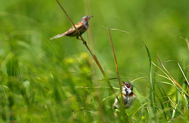 草原のあちこちで雄たちが、ソングポストをめぐって追いつ、追われつしていましたが、ここでは下の雄が追い払うでもなく、一生懸命唄っていましたので上の鳥は雌ではないかと思います。