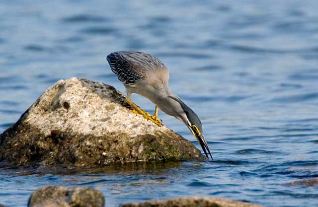 石の上から狙いをつけてさっと首を伸ばして水中の魚を捕まえようとする瞬間です。