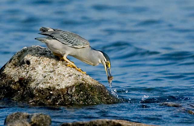 ねばり強く待っていますが、首を伸ばして水中に嘴を入れた時には魚をつかんでいます。