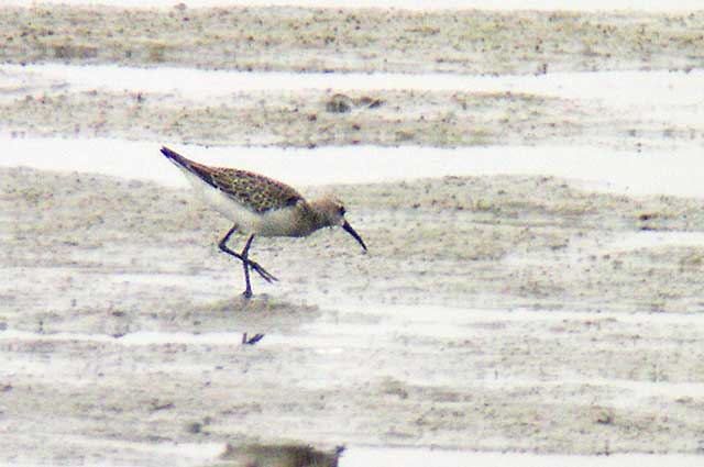 遠くて写真がもうひとつはっきりしませんが、下向きに曲がった嘴や肩羽、雨覆などのサブターミナルバンド、胸から頭への薄い燈色、、白い眉斑などのサルハマシギ幼鳥の特徴が見て取れます。