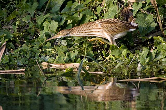 ヨシゴイの歩行は実にゆっくりしていますが体の割に強靱な脚と大きな足の指のお陰で見事なバランスをとりながら足場の悪いところを動いて行きます。