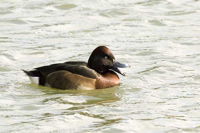 アカハジロ雑種としましたが、アカハジロにしては頭の色が緑がかった黒色ではなくて、黒褐色であること、、泳いでいるときに腹の白色部があまり見えないことなどから、アカハジロとキンクロハジロ、あるいはメジロガモ等とのAythya属の種間雑種ではなかろうかと思っています。