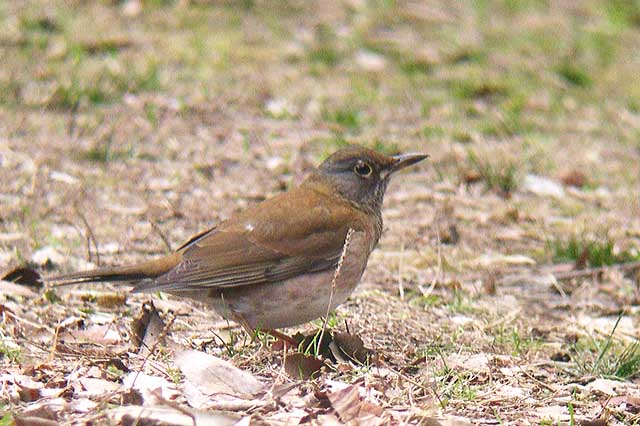 ノスリやオオタカを初め35種の鳥たちが見られて楽しい探鳥会でしたが、今年はどこもシロハラやトラツグミなど、ツグミの仲間が少ないようで、探鳥会の間には、珍しく姿を現しませんでしたが、解散になってベンチで昼食を食べていた時に飛んできて昼食を食べ始めたシロハラで、デジスコでの撮影です。