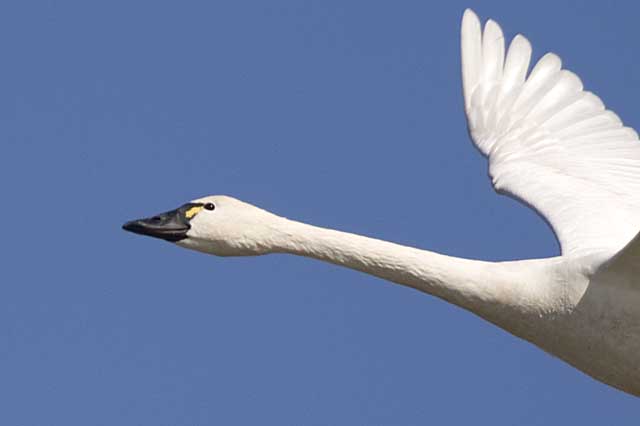 同上拡大写真 最初は、上の写真を見たときに亜種アメリカコハクチョウだと喜びましたが、拡大してよく見ると嘴の基部が黄色く、亜種コハクチョウだったかと、がっかりしていたのですがHPにアップ後にHORIZONさんからご指摘を戴き、図鑑を改めて見たところこの程度の大きさの黄色い部分を持つ鳥はやはり亜種アメリカコハクチョウであることがわかりました。 感謝です。 |