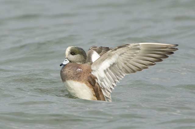 ヒドリガモとの識別ポイントの白い脇羽が見えています。