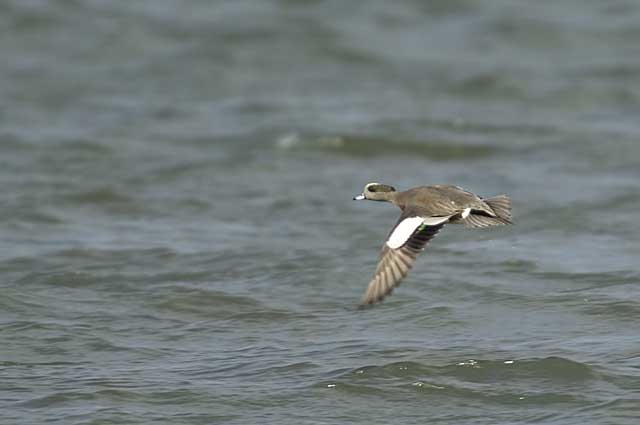 翼上面の白い雨覆いがヒドリガモと同様に飛ぶと良く目立ちます。