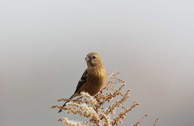 水上池を分ける堤防の上の芦原の中のセイタカアワダチソウの穂先で食事中のベニマシコの♀です。