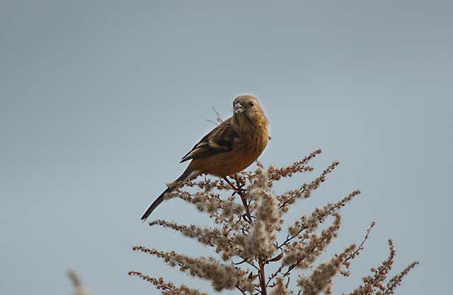 水上池を分ける堤防の上の芦原の中のセイタカアワダチソウの穂先で食事中のベニマシコの♀です。