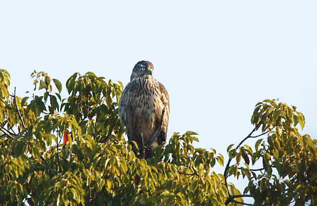朝日を浴びて水上池を樹上より見下ろしながら獲物のカモを見定めているところのようです。