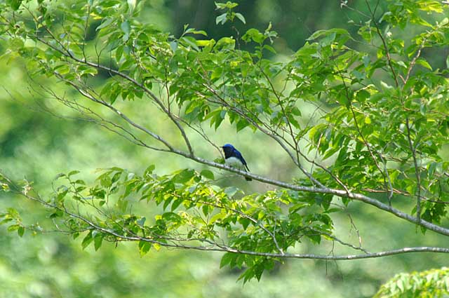 野鳥の会奈良支部の釈迦ヶ岳一泊探鳥会で出かけた、七面山を遠くに望む谷川沿いで唄っていたオオルリです。