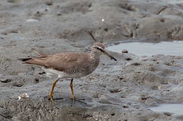 潮の引いた海岸で餌を探しているキアシシギです。。