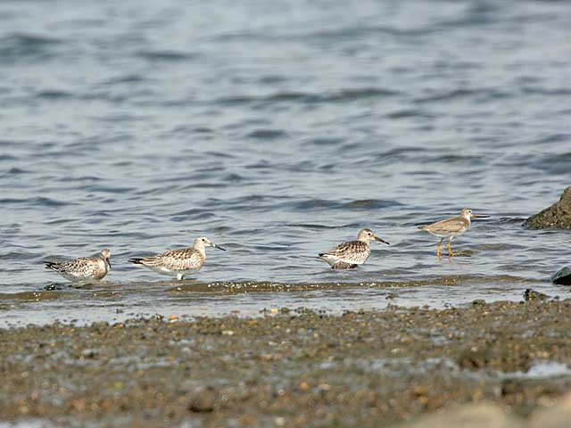 オバシギの群れの先頭を行くのはソリハシシギです。