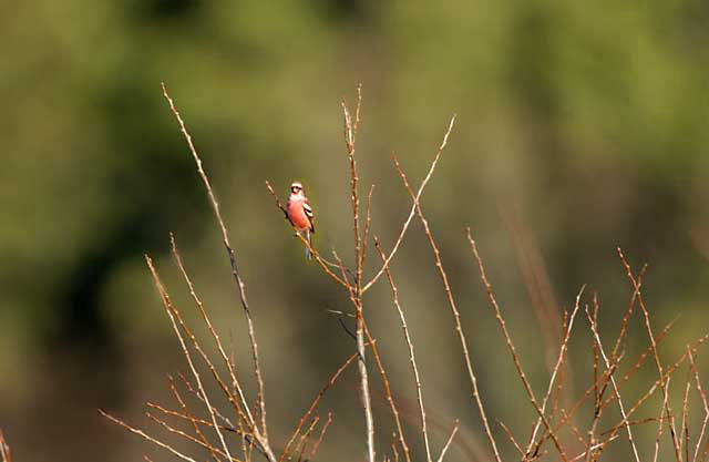 大泉緑地公園の帰りにちょっと覗いた、水上池の近くの芦原の雑木の頂上にベニマシコの雄が止まっていました。