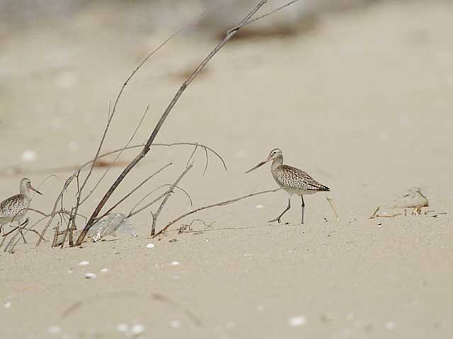 河口の干潟に別れを告げて、少し離れた海岸に出かけてみるとオオソリハシシギが乾いた砂浜にあがって餌を探していました。