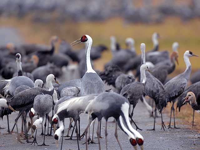 鶴観察センターの前に集まった鶴たちです。