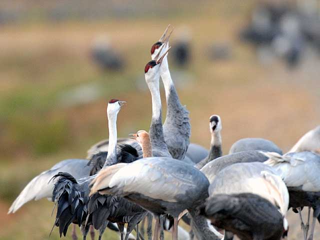 一羽が首を持ち上げて鳴き出すと、たちまち2羽、3羽と呼応するように鳴き声が響きます。