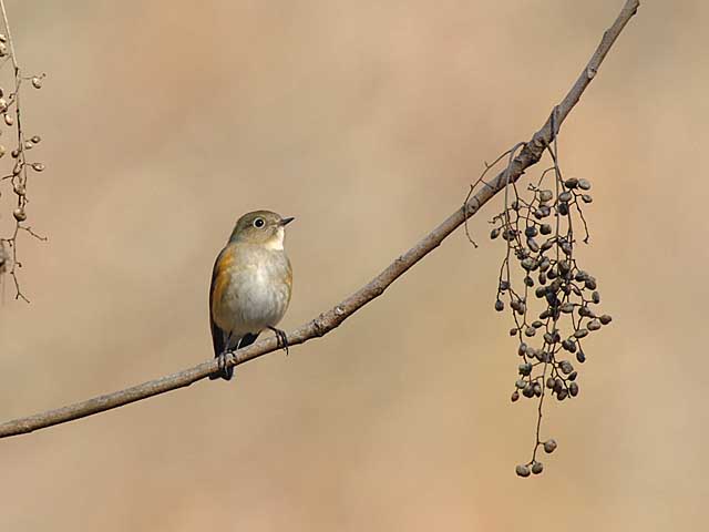 ヌルデの木の近くで待っていると運良く15分ぐらいで飛んできてくれた雌のルリビタキです。