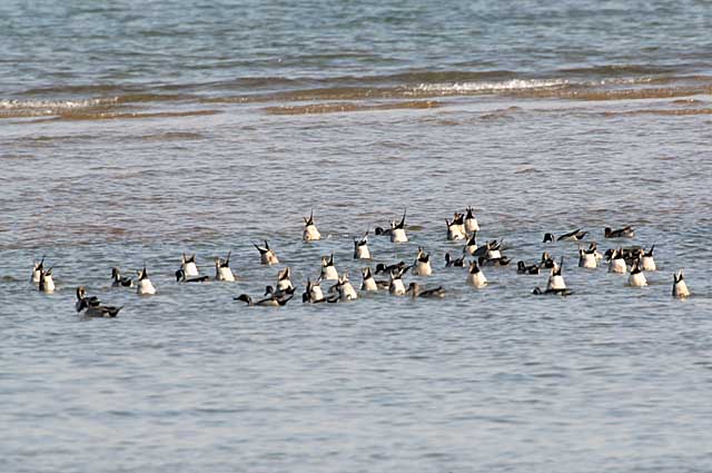 河口の沖の干潟近くの浅場では一斉に餌をとるオナガガモの群れがユーモラスです。