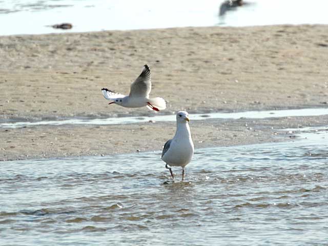 セグロカモメの後ろを飛んでいるのは別名都鳥のユリカモメです。
