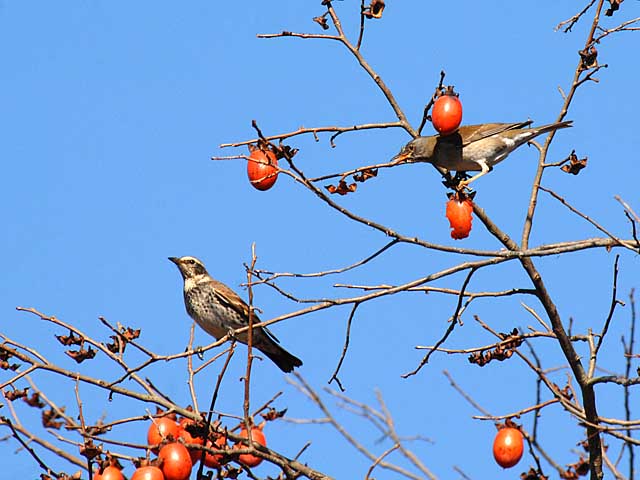 柿の木での鳥たちの序列は、ここでもやはり、強い順にムクドリ、ヒヨドリ、シロハラ、ツグミの順のようです。