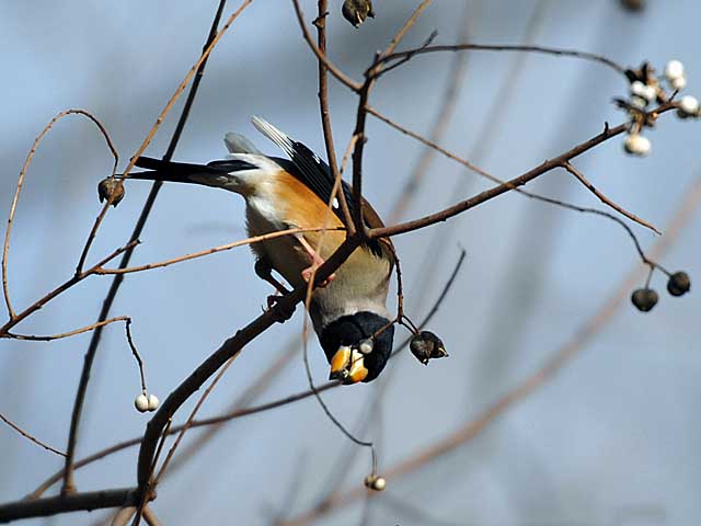 イカルに比べて少し小さくて、体色も褐色味が強く、頭の黒色部分が大きく、イカルの群のなかでもよく目立ちます。