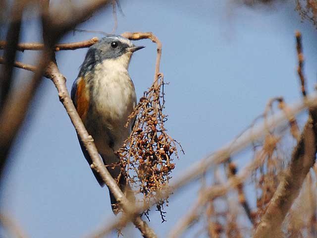 ヌルデの実を食べに来た馴染みのルリビタキです。